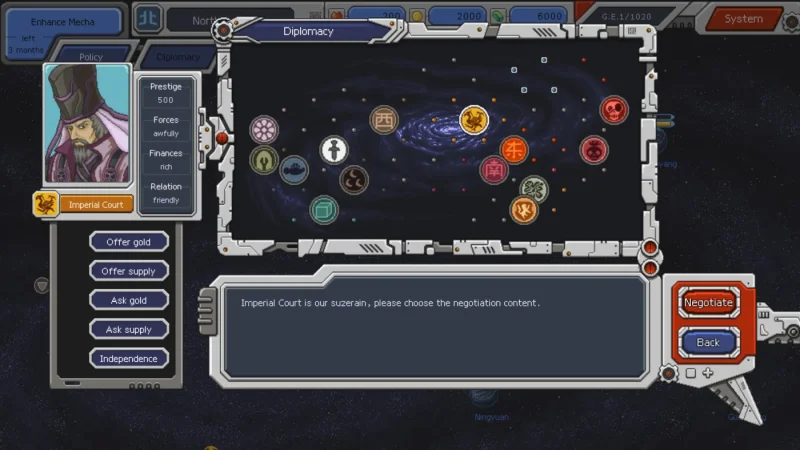 Управление вашим космическим доменом интуитивно понятно: развивайте промышленность, контролируйте торговые пути и следите за настроениями населения. Назначьте адмирала губернатором, чтобы ускорить рост, но помните - без мощного флота все ваши достижения беззащитны. Сражения разворачиваются на тактической сетке, где громоздкие линкоры встречаются с юркими меха-отрядами, умело использующими астероидные поля. Каждый командир обладает уникальным талантом, способным переломить ход битвы, однако гибель флагмана может посеять панику в рядах вашего флота. Порой даже подавляющее преимущество не гарантирует победы, ведь случайность может преподнести сюрприз, заставляя снова и снова вверять судьбу автоматическому расчету. Несмотря на упрощенную экономическую модель, игра покоряет своим характером, живыми диалогами и стилистикой, напоминающей классические проекты эпохи 16-битных консолей. Это идеальный старт для новичков в жанре, предлагающий вселенную, полную феодальных интриг, без необходимости погружаться в пучину сложных механик.
