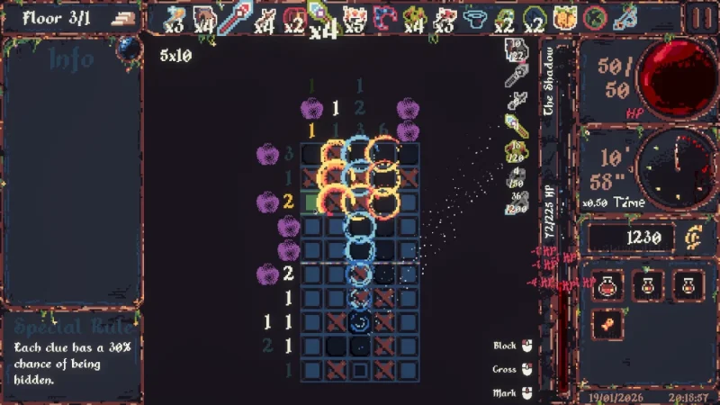 Каждая комната - это нонограмма-головоломка, которую нужно решить против времени. Ошибка отнимает здоровье, а истечение таймера ведет к неминуемому поражению. С каждым новым этапом сложность нарастает: доски увеличиваются, секунды тают, а боссы применяют коварные уловки. Они могут перевернуть решение с ног на голову, заставить клетки исчезать или вращать саму игровую плоскость. Это настоящая проверка нервов и сообразительности.