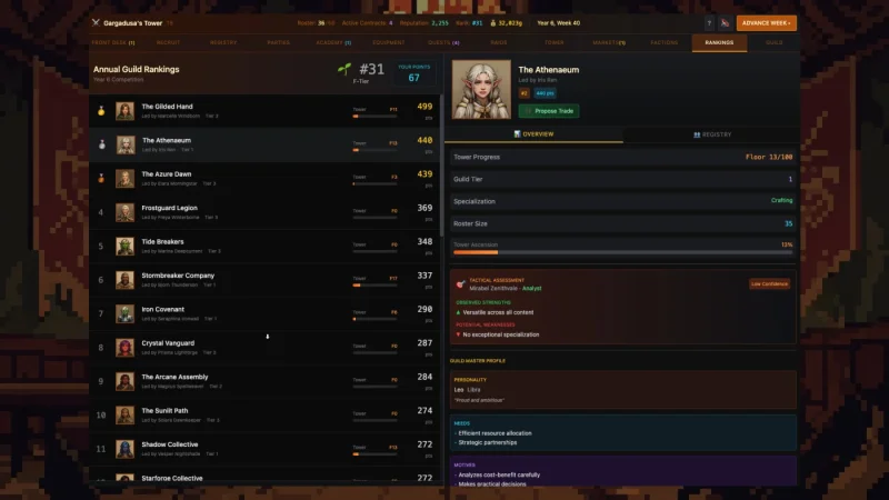 Гильдия - это вечный двигатель. Пока ветераны уходят на покой, а новобранцы гибнут в бою, вы строите казармы, нанимаете мастеров и улучшаете снаряжение. Ваша цель - обойти конкурентов в бесконечном спуске в глубины башни. Это живой, дышащий мир, где все взаимосвязано. Здесь нет кнопки паузы, только непрерывный поток времени и ваша стратегия. Сможете ли вы выковать из своего братства имя, которое будут помнить веками?