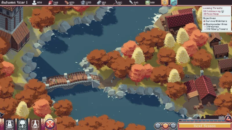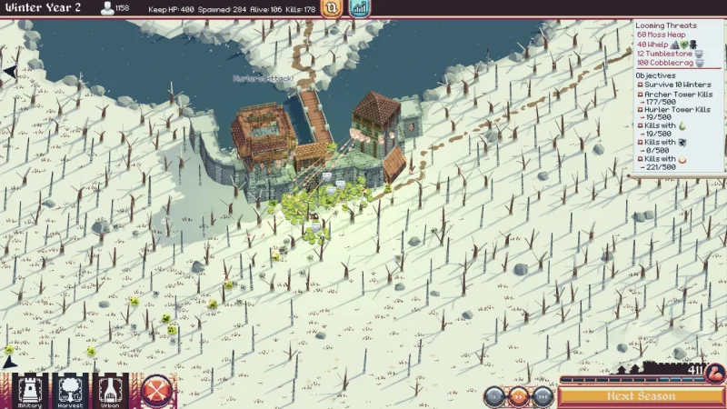 Возводите стены и башни, учитывая рельеф. Реки и обрывы становятся вашими союзниками, усложняя путь врагам. Вооружайте укрепления разными видами оружия, а в магические башни ставьте элитных волшебников. Каждая зимняя волна — это экзамен на прочность. Если башни расставлены грамотно, жители спокойно ходят на работу, не отвлекаясь на крики демонов.