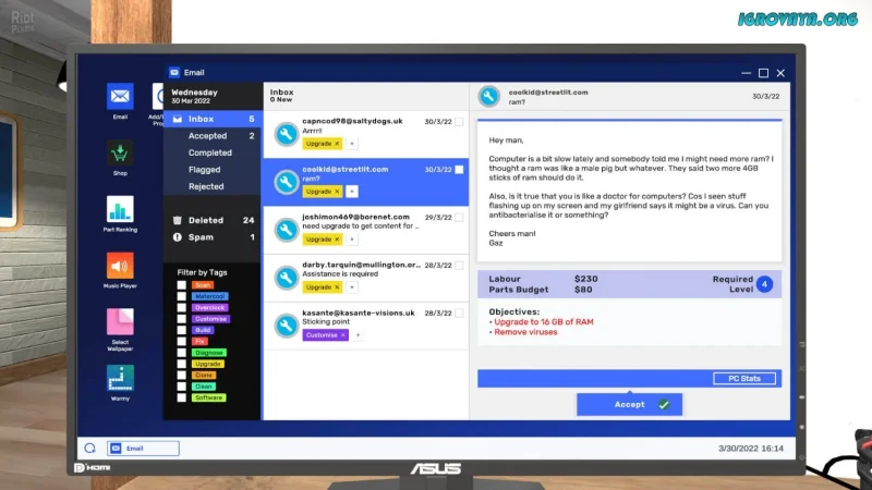 В дополнение к увлекательному процессу сборки, вы также сможете окунуться в повседневную рутину бизнеса. Вам предстоит следить за запасами комплектующих, находить лучшие предложения для закупок и контролировать бухгалтерский учет всех заказов. Регулярно проводите анализ финансов, чтобы избегать банкротства и максимально эффективно использовать ресурсы.