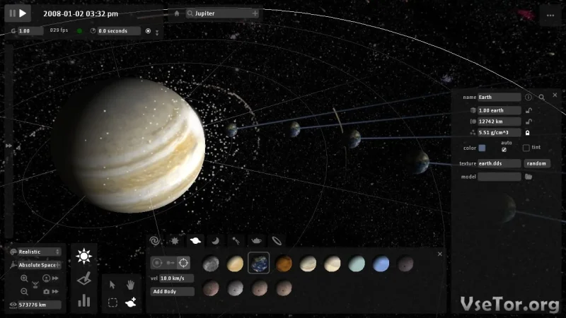 - Создание собственной солнечной системы с неограниченным числом планет и спутников.