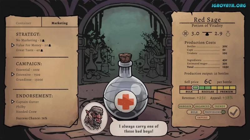 Преобразуйте свою небольшую лавку в элитный магазин, способный поразить конкурентов. Кроме обычных клиентов, к вам будут обращаться VIP-гости с особыми заказами на экзотические эликсиры. Успешное выполнение таких заданий принесет вам не только щедрое вознаграждение, но и славу, что привлечет новых клиентов. Помните, что провалить задание нельзя — ваши заказчики могут быть очень влиятельными, и ошибка обернется серьезными последствиями!