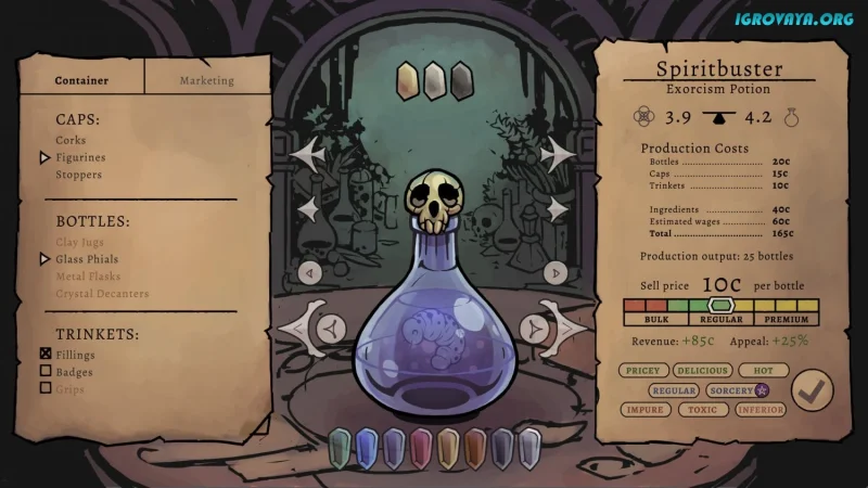 Вы можете столкнуться с долгими процессами создания зелий, если решите скачать Potion Tycoon. Именно поэтому важно оптимизировать ваше оборудование для более быстрого производства! Создайте флакон для каждого нового зелья, выбрав его форму, цвет и крышку. Упаковка играет ключевую роль в успешных продажах. Придумайте оригинальное название и установите разумную цену. Чем интереснее ваше зелье, тем выше его стоимость и внимание со стороны покупателей.
