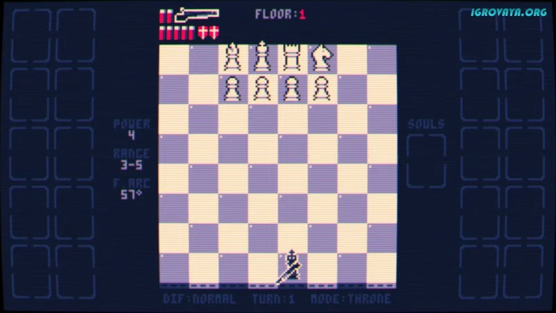 Вам предстоит сыграть в шахматы, при этом вместо привычных фигур в вашем распоряжении будет только король с огнестрельным оружием. Важно не забывать о движениях вражеских фигур, которые могут неожиданно поставить вас в сложное положение. Не позволяйте противнику загнать вас в угол; применяйте дробовик с умом, уничтожая его фигуры на вашем пути. Достигните белого короля, чтобы завершить сражение.
