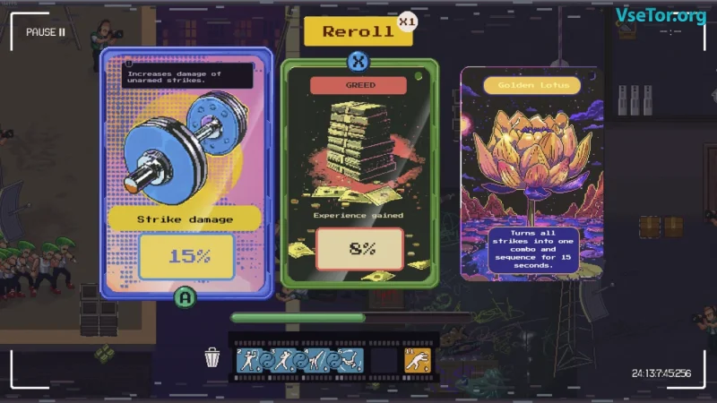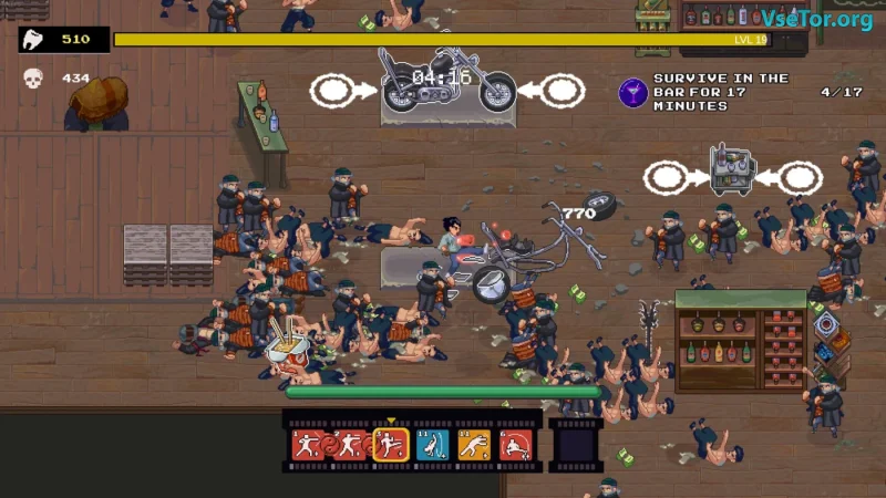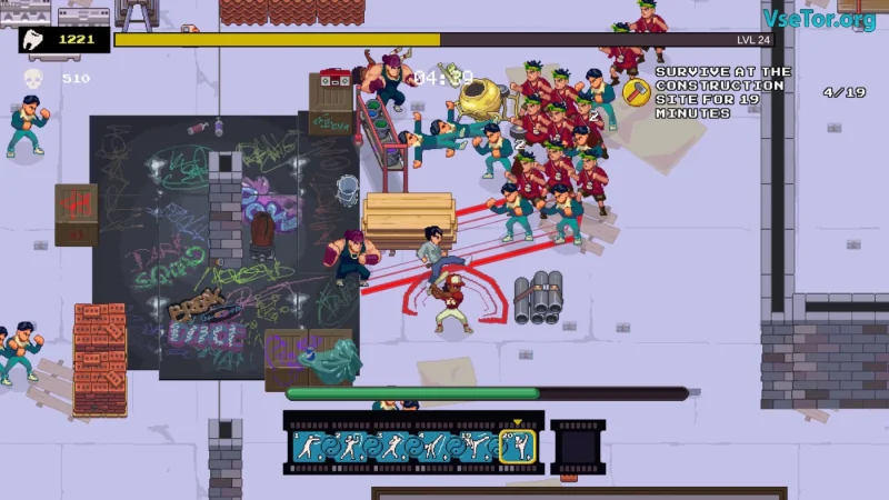 Karate Survivor — это увлекательная игра, где динамика схваток соединяется с атмосферой классических боевиков 80-х и механиками, знакомыми фанатам Vampire Survivors. В этой захватывающей приключенческой игре у вас будет возможность стать истинным мастером боевых искусств, вступая в битвы с безжалостными уличными бандитами, применяя как свои навыки, так и импровизированное оружие.
