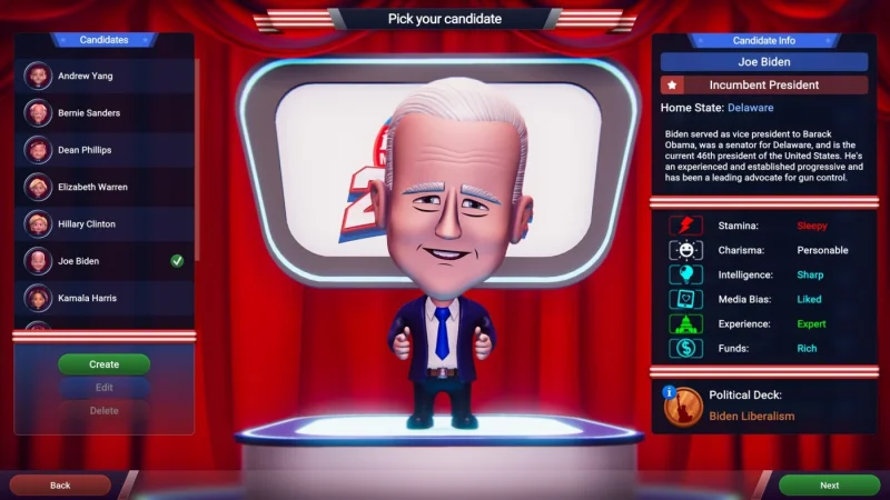 The Political Machine 2024 предлагает вам уникальную возможность стать кандидатом на пост президента Соединенных Штатов в 2024 году. Вы можете выбрать одного из известных политиков, таких как Трамп или Байден, или создать собственного персонажа с уникальными характеристиками. Каждый кандидат имеет свои сильные и слабые стороны — кто-то может похвастаться выдающейся харизмой, а кто-то обладает высоким интеллектом или поддержкой со стороны СМИ. Эти нюансы играют ключевую роль в вашей кампании.