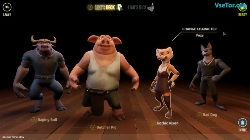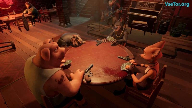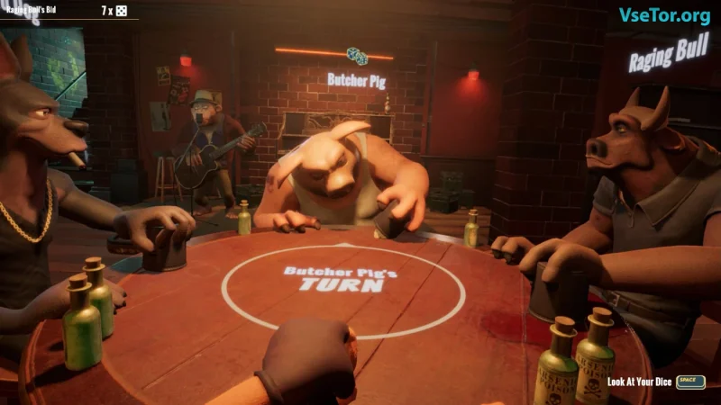 Игра Liar's Bar погружает игроков в захватывающий мир блефа, стратегии и рискованных решений. Выберите одного из четырех уникальных персонажей: свинью Бристл, пса Скабби, быка Тоара или лису Фокси и окажитесь в мрачной обстановке бара, наполненного интригами и опасностями. Основные режимы игры — Liar’s Deck и Liar’s Dice, где вам предстоит балансировать между истиной и вымыслом: каждое ваше решение может иметь фатальные последствия.