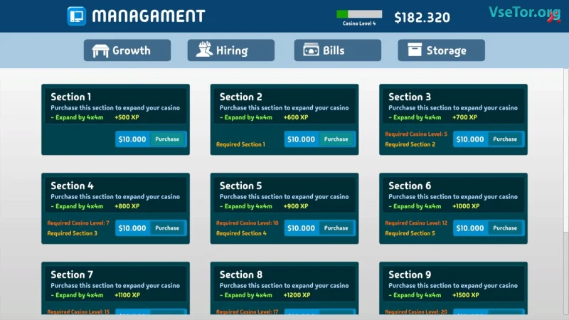 Игра предлагает невероятное разнообразие азартных развлечений: слоты, блэкджек, покер, рулетка и многое другое. Каждая игра требует тщательной проработки, ведь грамотная настройка процентного выигрыша и атмосфера зала непосредственно влияют на уровень удовлетворенности ваших гостей. Чем счастливее ваши клиенты, тем выше будут ваши доходы, позволяя вам быстрее развивать бизнес и добавлять новые зоны отдыха и развлечений.