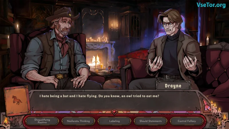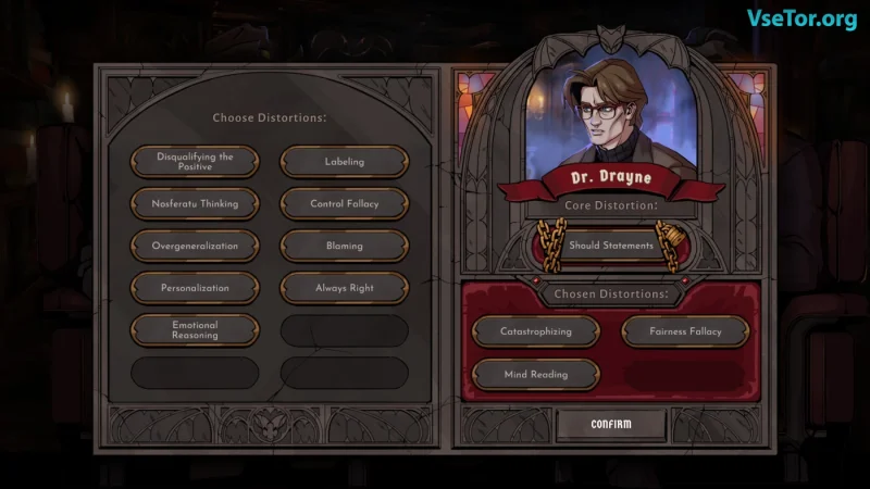 Ваша главная задача — оказать помощь другим вампирам в преодолении их внутренних конфликтов, применяя методы когнитивно-поведенческой терапии. Каждая встреча с пациентами неповторима: вы встретите благородную итальянку, которая избегает крови, или актёра с тягою к шекспировским трагедиям. На каждом сеансе требуется внимательный подход и анализ, чтобы выявить и помочь справиться с когнитивными искажениями, такими как черно-белое мышление или чрезмерная персонализация.