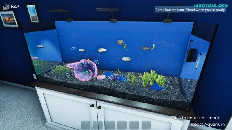 Сюжетная кампания предлагает вам постепенно продвигаться через разнообразные задания, которые со временем становятся все сложнее. Таким образом, вы сможете достичь удивительных высот и стать лучшим в своем деле. Креативный режим позволяет вам раскрыть свой потенциал и реализовать любые идеи, создавая аквариумы на свой вкус и после запуская в них новых обитателей. Не забудьте следить за состоянием своих питомцев: регулярная чистка аквариумов и создание комфортной среды — залог их хорошего самочувствия. Экспериментируйте с различными комбинациями рыб и украшений, чтобы сделать ваш аквариум поистине уникальным.