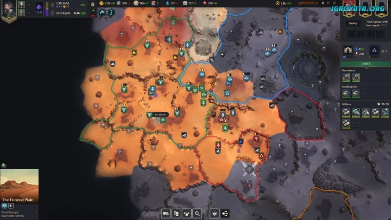 - Выбор из нескольких уникальных фракций, таких как Дом Атрейдес, Дом Харконнен и Дом Ордос.