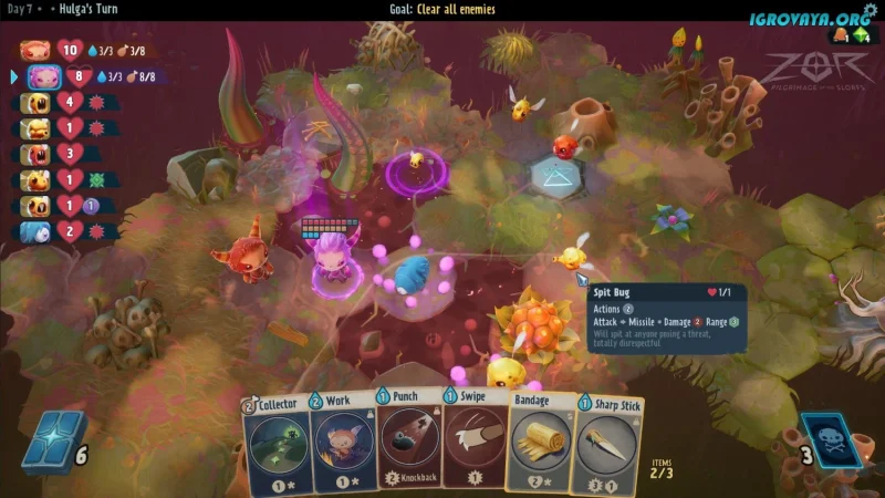 ZOR: Pilgrimage of the Slorfs выделяется своей захватывающей игрой, которая объединяет элементы приключенческого RPG, выживания и стратегической настольной игры. Исследуйте множество клеток карты, отправляясь в незабываемые приключения, собирайте необходимые ресурсы и сражайтесь с врагами, чья сила растет с каждым новым ходом. Боевая система сосредоточена на создании уникальной колоды карт с особыми навыками. Эти карты можно получить необычным способом, напоминающим выращивание: вам потребуется собрать ресурсы, такие как еда и вода, чтобы создать необходимые карты. Редкие карты потребуют больше усилий, но это позволит вам улучшать свою колоду по мере роста вашего персонажа.