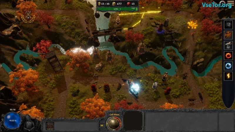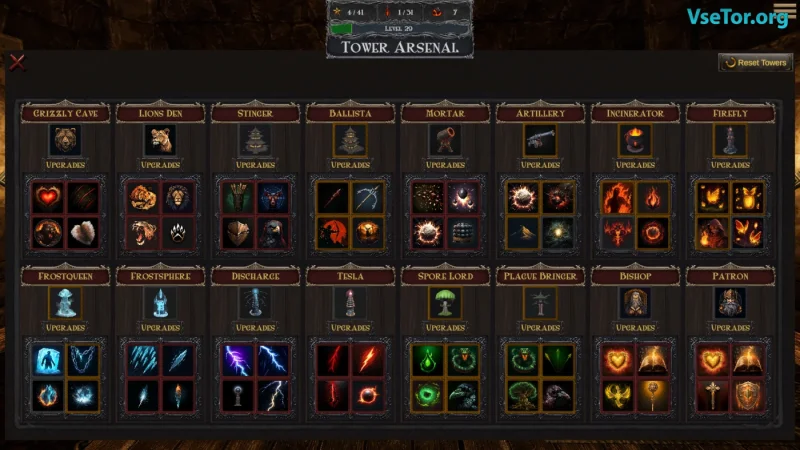 В вашем распоряжении оказывается 8 типов башен, каждая из которых имеет три основных уровня и два дополнительных с уникальными модификациями. Вы можете вооружать свои башни добытыми артефактами, которые усиливают урон или накладывают особые эффекты, например, призывают демонов или медведей для помощи в сражениях. Игровой процесс органично сочетает элементы RPG и стратегий, позволяя вам прокачивать навыки через древо умений, улучшать способности башен и открывать новые заклинания.
