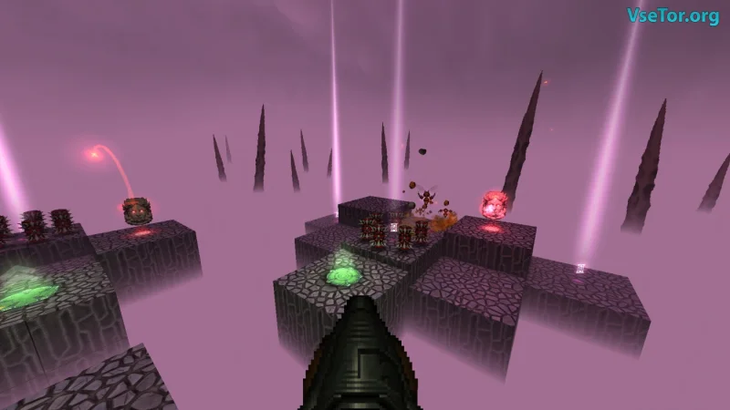 - Двумерные спрайты врагов и оружия на трехмерной арене, стилизованные под классические шутеры.