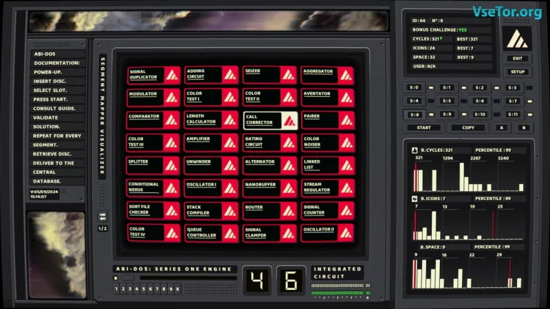 Центральный элемент игрового процесса — UBITS, разноцветные блоки данных, которые вы перемещаете по хитроумным системам команд и соединений. Ваша основная цель — оптимизировать различные процессы: минимизировать затраты времени, пространства и ресурсов, создавая элегантные и компактные решения. Механика ABI-DOS обеспечивает полную прозрачность: каждый ваш шаг логичен и предсказуем, а результаты — результат ваши стратегий и расчетов.