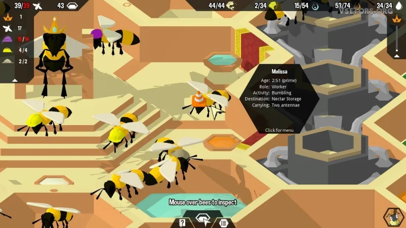 - Управление пчелами с уникальными навыками: от строителей до охранников.