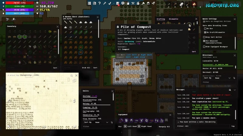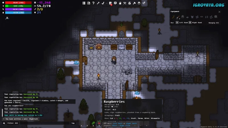 Wayward – это уникальный пошаговый рогалик, который сочетает в себе элементы симуляции выживания и песочницы. Вам предстоит не только выживать, но и крафтить разнообразные предметы, исследовать обширные территории, строить укрытия и выполнять множество других задач.