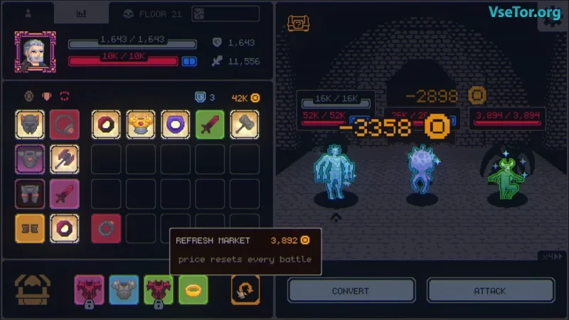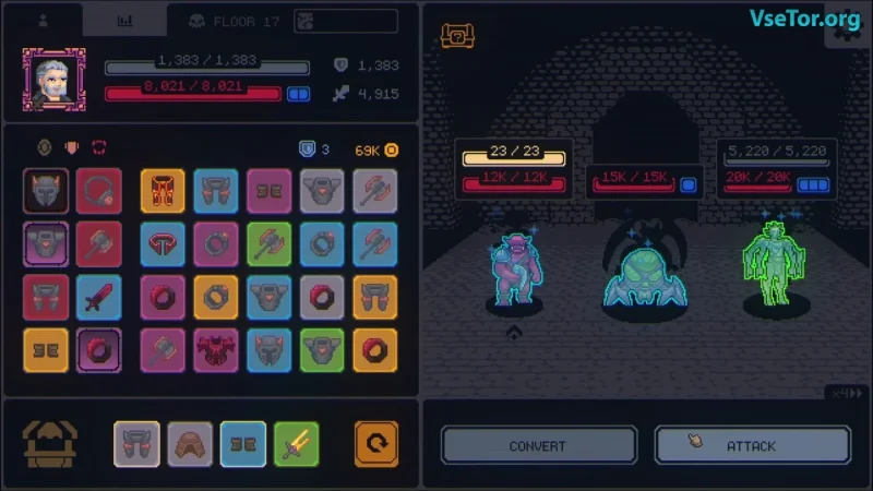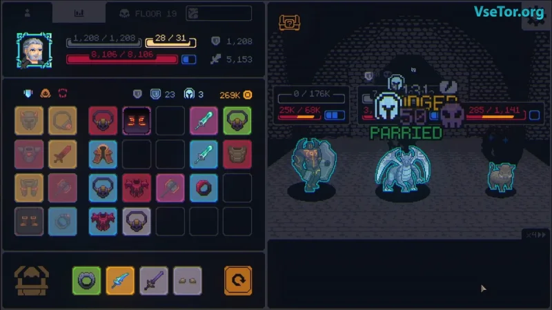 Главной отличительной чертой Megaloot является постоянно открытый инвентарь, который занимает значительную часть экрана. Это делает каждый предмет важным, ведь лут здесь не просто дополнительный ресурс, а ключевой инструмент, определяющий исход сражений. В процессе игры у вас есть возможность комбинировать предметы одного типа, улучшая их характеристики и создавая мощные сборки, подстраиваясь под свой стиль игры. Легендарные артефакты, такие как Пронзитель теней и Амулет жизни, значительно увеличивают ваши шансы на успех, даруя мощные баффы и улучшая параметры вашего персонажа.