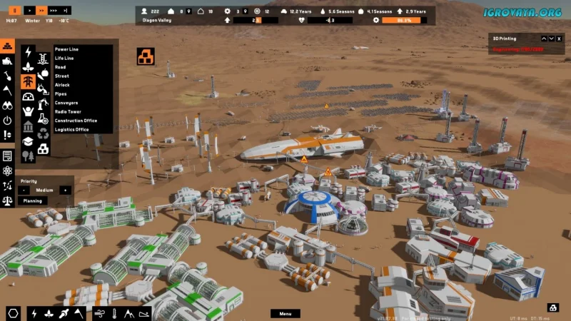 - Необходимость балансировать между строительством и социальной политикой для выживания ваших колонистов.