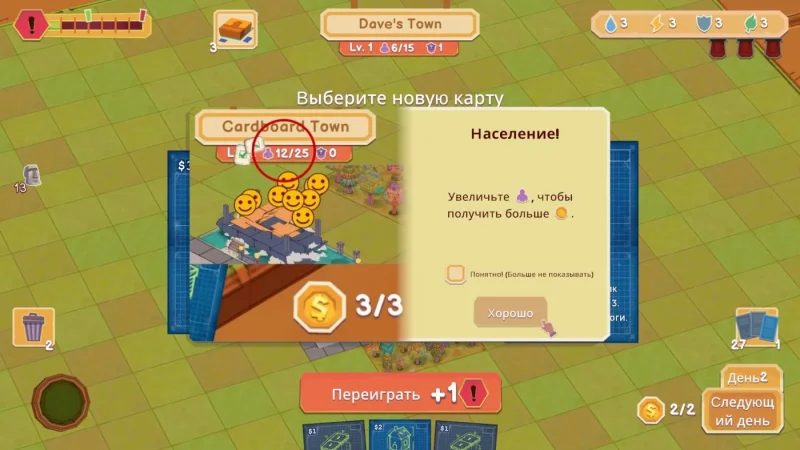 Вам предстоит столкнуться с множеством проблем и найти решения для каждой из них, демонстрируя, что нет ничего невозможного. Разработчики игры со страстью подошли к своему проекту, сочетая два, казалось, абсолютно разных жанра. Ключевым элементом игры является использование карточек для выполнения действий — каждая партия получаемых карт уникальна, что делает игровой процесс непредсказуемым и увлекательным. Попробуйте себя в этой необычной игре и скачайте Cardboard Town уже сейчас, чтобы начать собственное приключение по созданию идеального города!