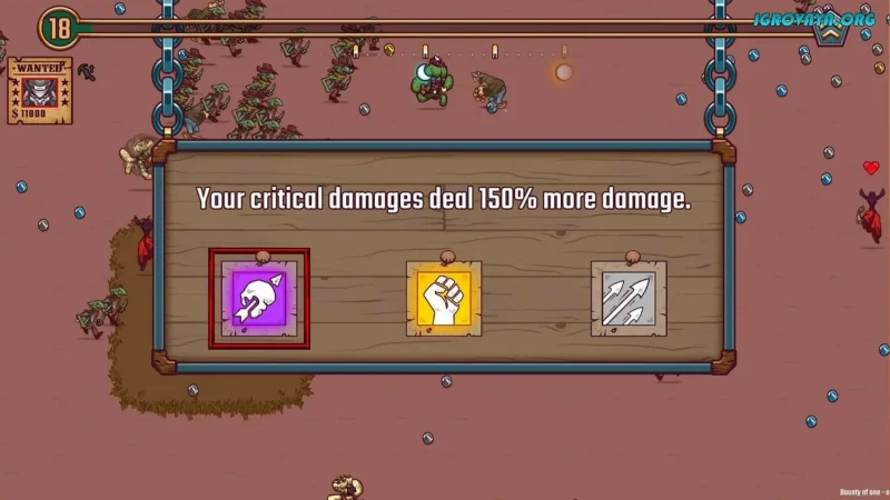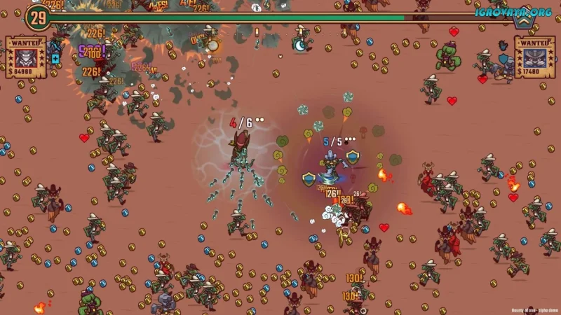 Геймплей Bounty of One реализован в лучших традициях жанра и обеспечивает увлекательный игровой опыт. Вам придется защищаться от непрекращающихся атак врагов, при этом заполняя прогресс-бар в верхней части экрана. При повышении уровня вы можете выбрать улучшение своих существующих навыков или освоить новое умение. Игра предлагает широкий набор возможностей, что дает вам простор для экспериментов и выбора стратегии, соответствующей вашему стилю игры.