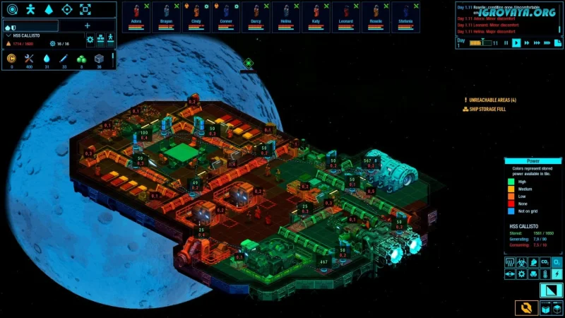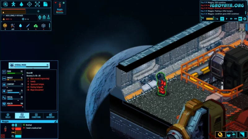 - Управление ресурсами: следите за запасами еды, кислорода и воды, предотвращая эпидемии.