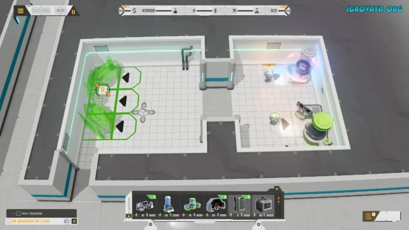 - Возможность расширять базу, создавая новые комнаты и лаборатории.