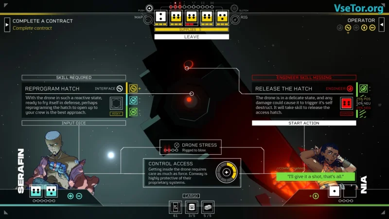Основная сюжетная линия сосредоточена на выживании и взаимодействии с вашей командой, что привносит множество тактических аспектов в игровой процесс. Ваша цель - успешное выполнение контрактов, сбор ресурсов и принятие решений, которые могут оказать значительное влияние на сюжет. Важной частью игры является система стресса, влияющая на ваши действия: накопленный ущерб может лишить вас возможности бросать кубики. Однако вы можете поддерживать себя и своих товарищей, что открывает доступ к временным бонусам, например, повторным броскам кубиков или увеличению их значения.