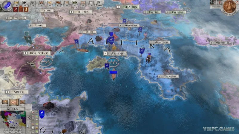 Геймплей сочетает в себе знакомые элементы, такие как управление городами, строительство дорог и ферм, а также торговлю ресурсами, включая золото, железо и знания. Дипломатические отношения требуют тщательной проработки, а ограниченность поставок из городов добавляет сложности в дальние походы. Каждый ход предоставляет вам время для создания своей уникальной истории, будь то объединение Греции или ее падение под натиском врагов. Для любителей состязаний предусмотрен мультиплеер, где можно проверить свои силы против других игроков.