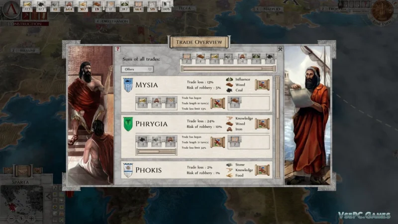 Особенность игры заключается в том, что мифология вплетена в основные механики. Вам предстоит отправлять своих генералов на захватывающие квесты, такие как поиск Золотого руна или распутывание Гордиева узла. Эти задачи добавляют дополнительную глубину и атмосферу легендарности вашему игровому процессу.