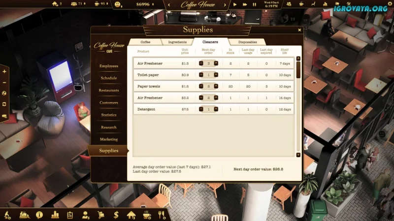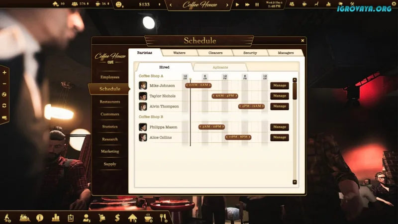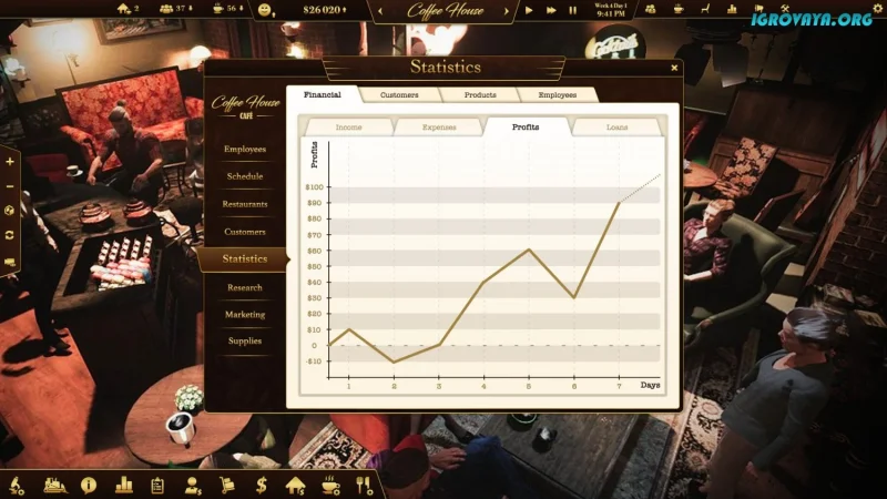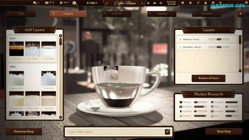 В этом увлекательном симуляторе именно вы решаете, как будет выглядеть ваша кофейня и чем она будет отличаться от конкурентов. Вам предстоит самостоятельно выбрать местоположение, количество сотрудников и ассортимент кофе. Также придется определиться с ценами и расстановкой столиков как внутри помещения, так и на улице. Ваша ответственность за успех бизнеса огромна.