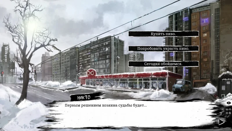 Игра MOOD построена на взаимодействии с персонажами и выборе реплик, которые не просто закрывают диалог. Здесь разговоры ведутся так, будто вы находитесь с другом за чашкой чая, насыщены подколами, неловкими моментами и темной иронией. Вокруг вас — улицы, которые напоминают забытое место: тусклые фонари, обшарпанные стены, а в воздухе раздаются звуки тягучего дарк-эмбиента с элементами пост-панка. Вы можете украсть бутылку пива из магазина, закурить на углу или просто продолжить свой путь — такие детализированные мелочи придают игре живость.