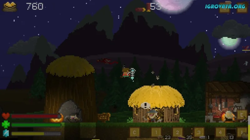Мир двухмерный, но наполнен деталями: от простого сбора материалов до создания целого города с домами и важными постройками. Не забывайте, что враги не дремлют — монстры и боссы готовы бросить вызов в любой момент. Создайте оружие, прокачайте навыки и будьте готовы к сражениям.