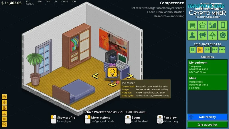 Погрузитесь в атмосферу становления цифровой индустрии с игрой Crypto Miner Tycoon Simulator. Начинайте свой путь еще в далеком 2010 году, сжатые стены подростковой комнаты станут стартовой площадкой для создания первой криптофермы. От скромного начала — к масштабной империи с множеством офисов и внушительными серверными залами.