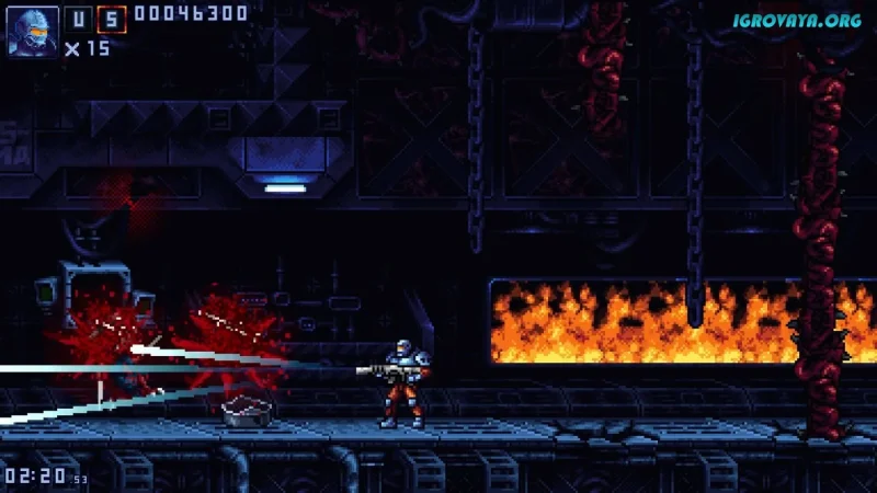 Геймплей построен на классике side-scrolling: вы бегаете по локациям, уничтожаете вражеских солдат, прорветесь через защитные турели, обходите ловушки и готовитесь к финальному столкновению с босса. С каждым уровнем бой становится всё жёстче, и это заставляет держать пальцы наготове.