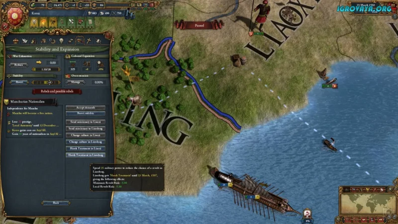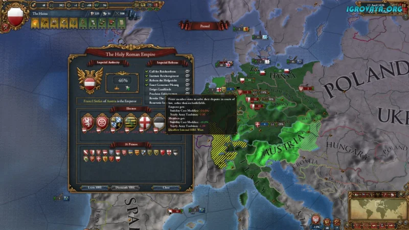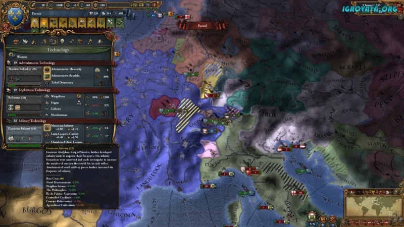 Игра начинается в 1441 году, когда вы выбираете государство и берёте на себя ответственность за его судьбу. Ваша задача — управлять всеми аспектами жизни страны: вести внешнюю политику, развивать торговые пути, бороться с врагами и поддерживать внутренний порядок. Europa Universalis IV дарит полную свободу действий, не заставляя двигаться по заранее заданному пути.