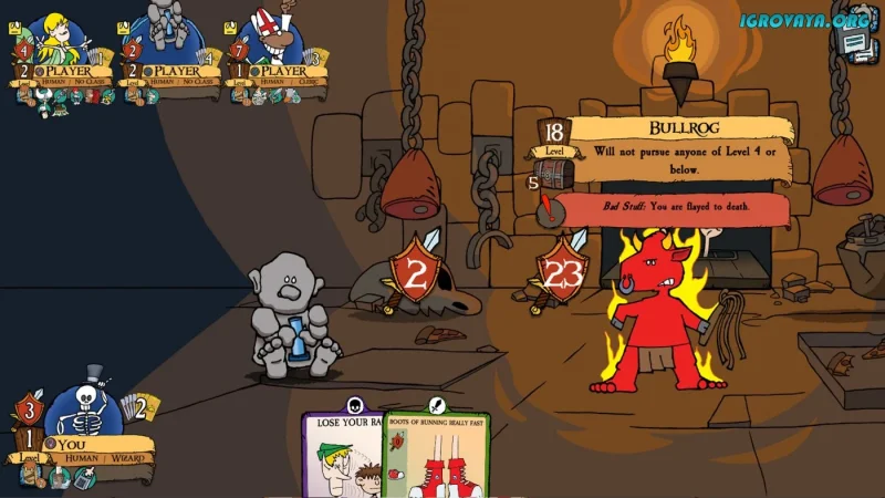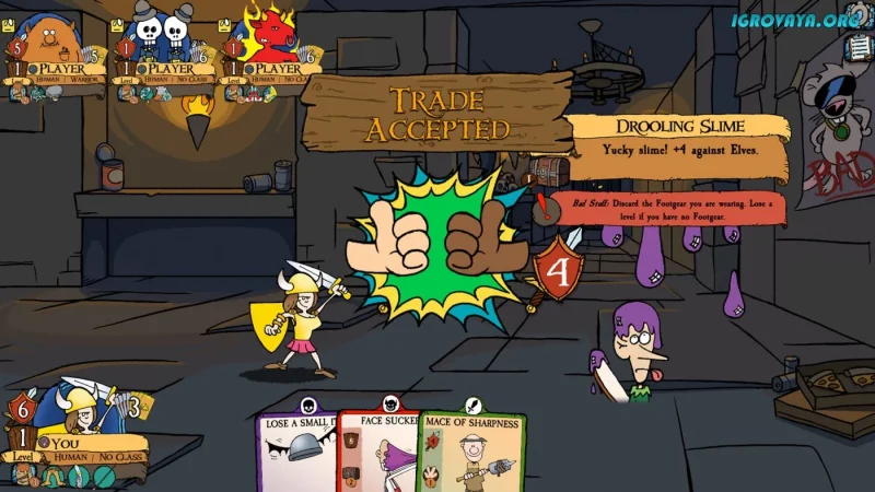 Каждое новое испытание бросает вызов, а случайные события и встречи подкидывают неожиданные повороты, которые заставляют держать ухо востро. Если вы готовы к сумасшедшим ходам, интригам и даже предательствам ради выгодной карты — Munchkin Digital подарит массу ярких впечатлений. Игра заставляет не просто нажимать кнопки, а думать и смеяться, ведь тут каждый бой — это небольшая история с изюминкой.