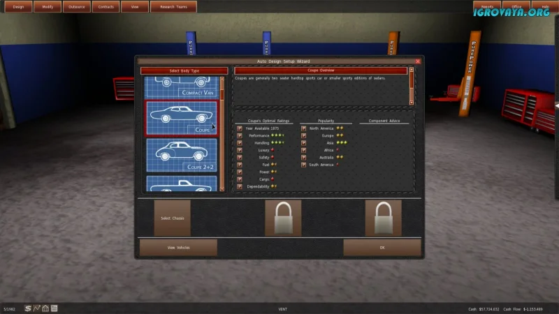 Создание новых моделей в GearCity — это настоящий вызов. Вы будете разрабатывать шасси, двигатели, тормоза, электронику и коробки передач, а дизайн автомобиля может стать настоящим испытанием: одна мелкая ошибка способна испортить впечатление от всей машины. И это только начало — тест-драйвы, реклама, маркетинг и логистика потребуют от вас не меньшего внимания и навыков.