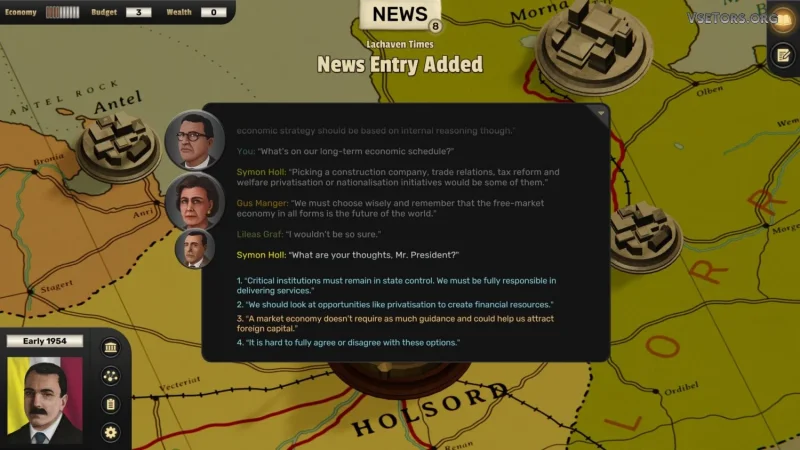 В игре главный упор сделан на интерактивные беседы и выборы, которые отражаются на благополучии государства. Вы не просто управляете — вы фактически живёте в этом мире со всеми его вызовами и противоречиями.