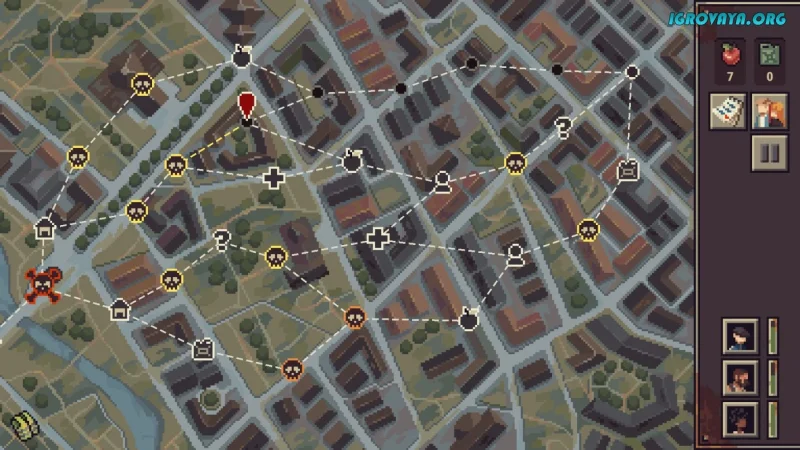 Карта игры генерируется случайным образом при каждом запуске, что делает каждое прохождение уникальным и непредсказуемым. На ней вы встретите как неожиданные события, так и опасные битвы, где умения героев и тактика решают исход схваток. С каждым уровнем опасность растёт, заставляя принимать трудные решения — иногда жертвы неизбежны ради спасения команды.