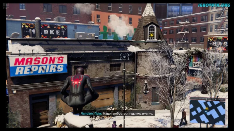 Нью-Йорк в игре предстает как настоящая зимняя сказка: заснеженный Манхэттен, узкие улочки Бруклина и украшенный к Рождеству Гарлем подарят атмосферу праздника. Вокруг кипит жизнь: прохожие фотографируют Майлза, дети играют в снежки, а где-то звучит живой джаз. Сюжет ведет через базы Roxxon, заброшенные склады и опасные мосты, щедро приправленные взрывами и напряжением. Дополнительные задания тоже радуют разнообразием: собирайте капсулы времени, ремонтируйте сломавшийся автобус или спасайте кота с забавным прозвищем Человек-паук.