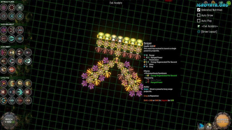 В Sipho есть возможность собрать уникального героя, комбинируя десятки различных частей тела — от базовых соединений до мощного оружия. Питайтесь водорослями и остатками врагов, чтобы улучшить характеристики персонажа и расширить арсенал. Присоединяйте зооид в любое место на теле вашего существа, создавая причудливые и неожиданные формы.