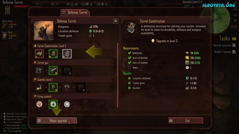 - Постройку оборонительных сооружений и установку турелей для защиты базы