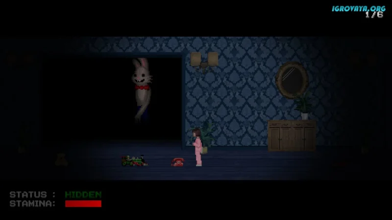 Проявляя ловкость и быстроту реакции, вам предстоит укрываться за мебелью, следить за светом и звуками, ведь кролик угадывает ваше местонахождение по самому тихому шороху. Его пути не поддаются предсказанию — он словно тень, которая всегда на шаг впереди. Используйте индикатор на экране, чтобы понять, заметили ли вас, и не дайте страху застать врасплох.