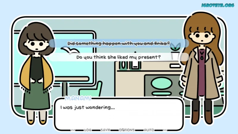 Пиксельные фоны в нежных пастельных оттенках и аккуратные портреты персонажей вместе с ненавязчивой мелодией создают атмосферу уюта и интима. Диалоги полны живых деталей — как, например, момент, когда Хиру с улыбкой на губах заполняет анкеты в спа, а её друг шутит, предлагая записать в графе «пол» слово «инопланетянин».