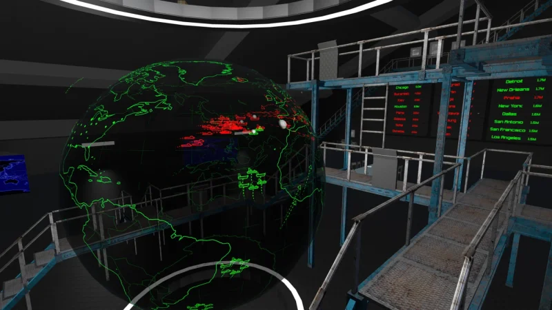 DEFCON VR приглашает вас на территорию, где ледяное дыхание Холодной войны чувствуется в каждой секунде. Здесь вы не просто гость, а наблюдатель событий, разворачивающихся в центре виртуального командного пункта. Атмосфера вдохновлена классическим фильмом «Военные игры» и подхватывает паранойю старого ядерного конфликта, только теперь всё это оживает в невероятно реалистичном VR-формате. Карты, голографические панели, огромные экраны - перед глазами разыгрывается глобальный конфликт, словно непрекращающийся кошмар наяву.