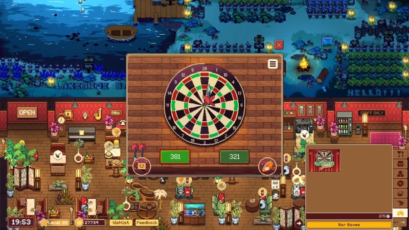 Lakeside Bar цепляет простыми, но продуманными механиками. Нанимайте и обучайте персонал, расширяйте меню напитков и закусок — от классического эля до оригинальных коктейлей и горячих начос, приготовленных болтливой микроволновкой. Зарабатывайте золото за отличную выручку, серебро за меткость в дартсе, а бронзу — за удачный улов на рыбалке, хотя иногда монетки путаются между собой. Интерьер можно обновлять, предметы — покупать и продавать заново, но их невозможно передвинуть. Детали — отдельная радость: крошечные бокалы, довольные мордочки гостей, ощущение настоящего спокойствия. Бар можно сделать вторым домом или тихим уголком для фона, настраивая работу персонала между игрой в дартс и вечерами у костра с видом на озеро. Lakeside Bar идеален для тех, кто ценит уют, неторопливость и немного волшебства на экране.