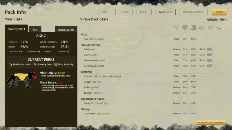 Со временем ваша стая обзаведётся потомством: маленькие щенки — сначала неуклюжие мохнатые шарики, со временем превращаются в опытных хищников. Разве не чудо видеть, как они впервые выходят на охоту? Сезоны сменяют друг друга, природа диктует свои правила: весенние паводки, зимние шторма, стада копытных то появляются, то исчезают вдали, а хитрые лисы устраивают свои маленькие пиршества. Гибкая генетика делает каждого волка по-своему особенным: от окраса до темперамента. Будете ли вы отважным лидером или осторожным одиночкой — зависит от вас. В кооперативном режиме всегда можно позвать друга и вместе воспитать волчат, защищая территорию от чужаков. Когда приходит время, вы передаёте эстафету жизни своим детям — и цикл продолжается. Мир WolfQuest живой, непредсказуемый и никогда не повторяется дважды.