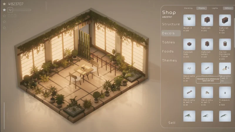 Выбирайте между двумя режимами: постепенно развивать заведение, постепенно открывая новые детали, или сразу получить полный арсенал инструментов и строить без ограничений. Хотите небольшой чайный домик? Пожалуйста. Мечтаете о просторном ресторане с видом на каменистый сад? Всё возможно. Каждый элемент интерьера - от скромного коврика до изящных растений и посуды - настраивается по вашему вкусу. Время здесь течет так, как хочется вам: можно ускорить события или просто наблюдать за игрой света и теней. Звуки дождя, нежная музыка и мягкая цветовая палитра позволяют забыть о повседневной суете и почувствовать настоящее умиротворение. Даже если на карте всего одна кухня, это не повод для грусти - атмосфера комфорта и покоя берет верх. Иногда хочется просто остановиться, проникнуться моментом и вдохнуть аромат зелени.